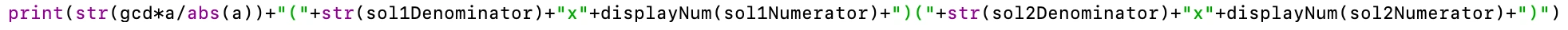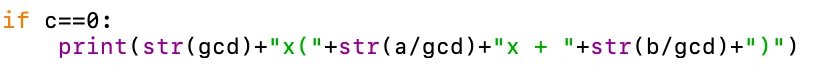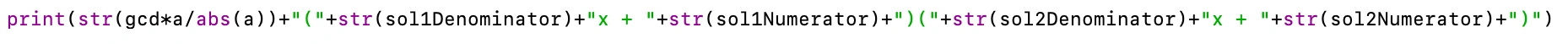 print(str(gcd*a/abs(a))+"("+str(sol1Denominator)+"x"+displayNum(sol1Numerator)+")("+str(sol2Denominator)+"x"+displayNum(sol2Numerator)+")")
