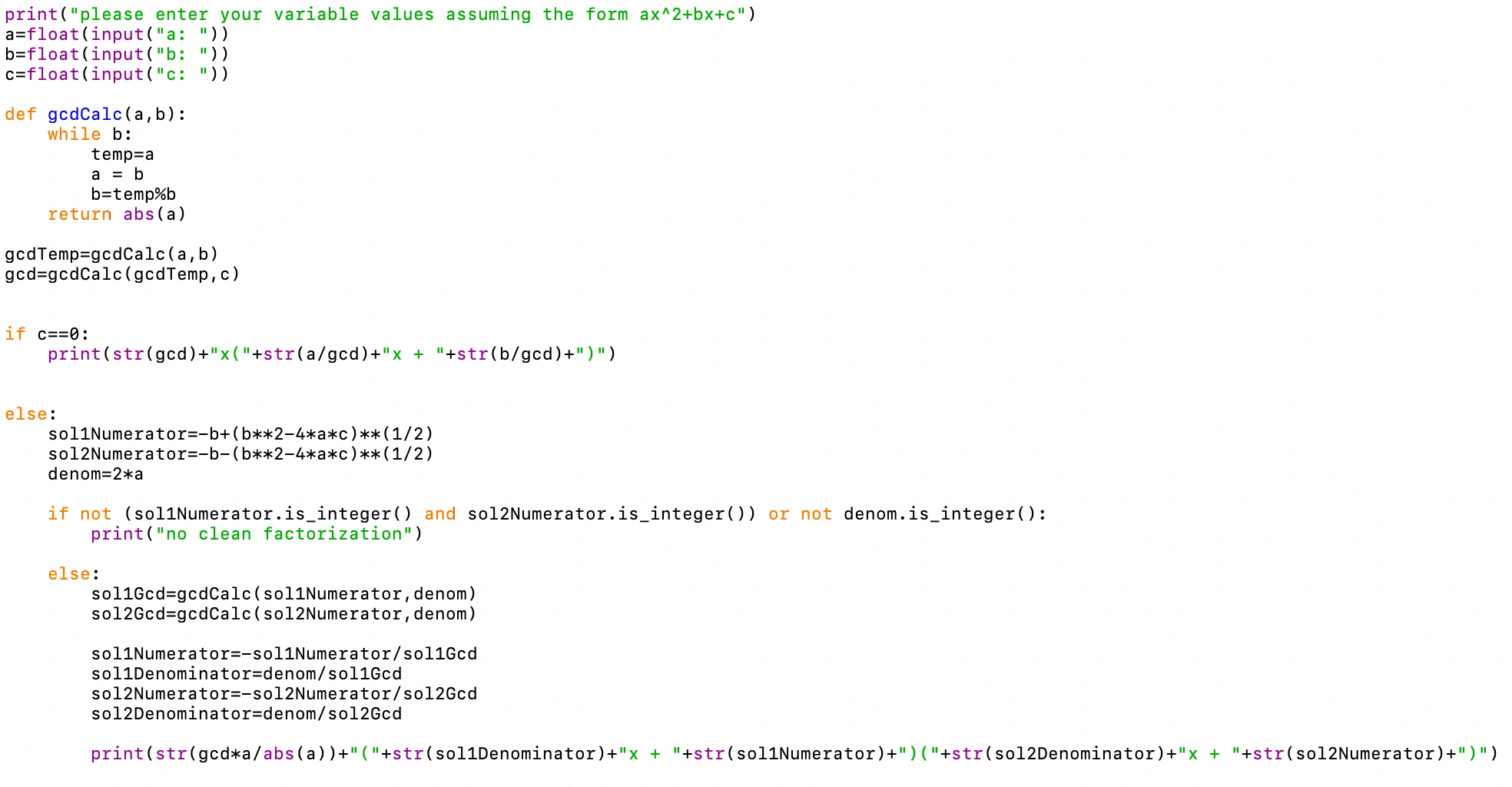 But we want to be able to factor all sorts of quadratics. So we are going to add an else statement to our c==0 statement we wrote above, and we are going to start off by finding the two possible solutions using the quadratic equation.