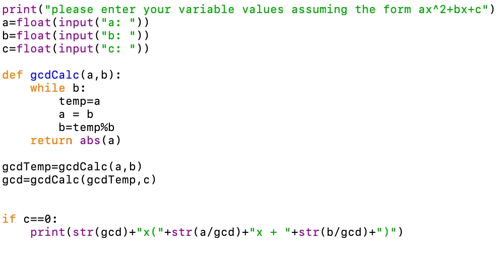 Now we are going to perform the first step of factoring: finding the greatest common divisor (GCD) between our three terms. We will be writing our own GCD function. Our function will, in essence, swap the two numbers, making the new first number equal to and the new equal to . It will keep doing this until is zero.