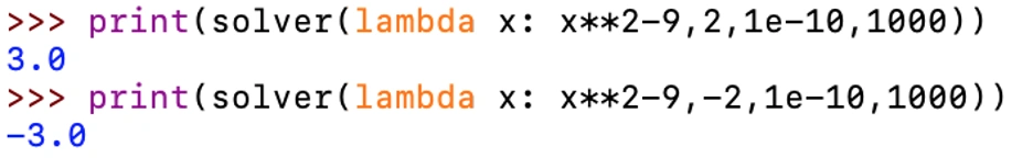 Inside the loop, we calculate y = f(xn). If its absolute value is within epsilon of zero, we return xn as the solution.