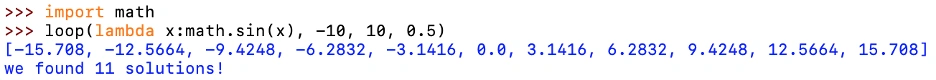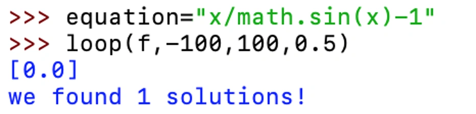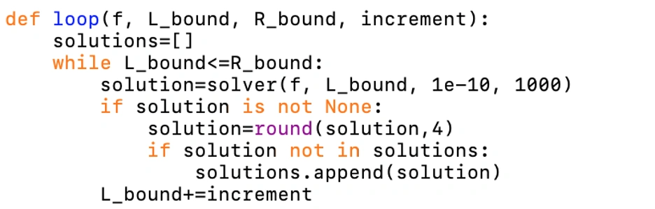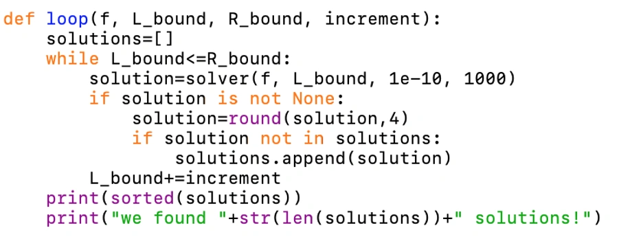 To find all roots within a range, we can create a loop function that sweeps through the domain with a specified increment, calling solver at each step.