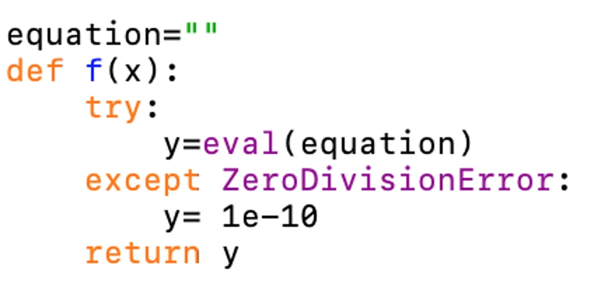 To prevent crashes at undefined points (like in ), we wrap the function evaluation in a try-except block.