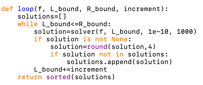 We will adapt the solver and loop functions from the previous root-finding tutorial. We modify the loop function to return a list of solutions instead of printing them directly.