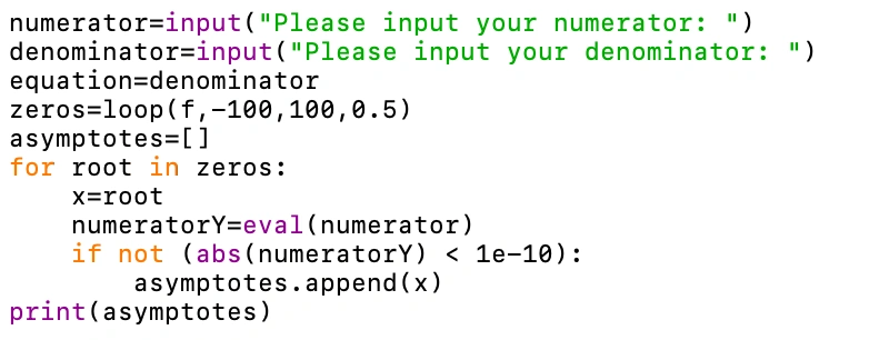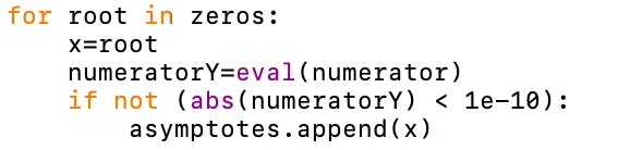 If the value of the numerator at a root is not close to zero (i.e., abs(numeratorY) >= 1e-10), we identify it as a vertical asymptote. If it is close to zero, it indicates a removable discontinuity (a hole).